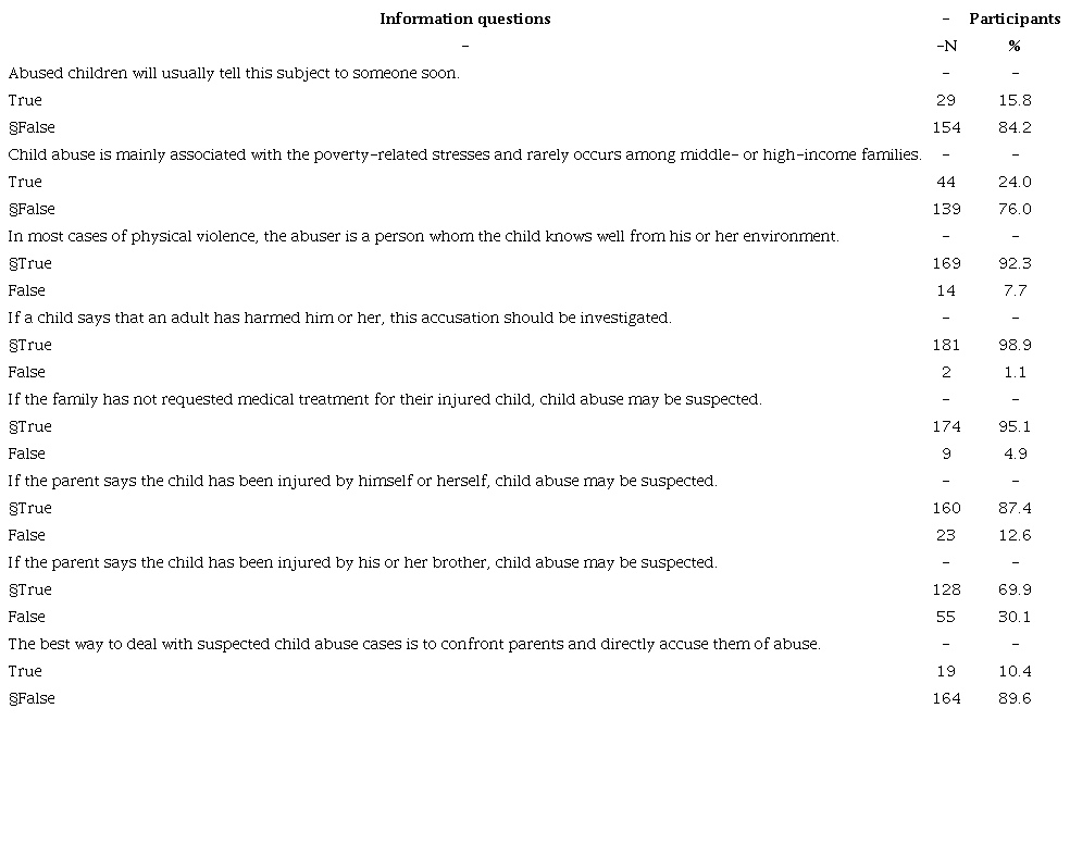 Table 4 shows the presentation of the participants’ answers for the information questions on the social signs and symptoms of child abuse. The majority (69.9-98.9%) of participants gave correct answers. On the other hand, especially in information questions “If the parent says the child has been injured by his or her brother, child abuse may be suspected.” and “Child abuse is mainly associated with the poverty-related stresses and rarely occurs among middle- or high-income families.”, the correct answer rates were lower than the other questions. The proportion of the participants with only correct answers was 43.7% (80 participants).