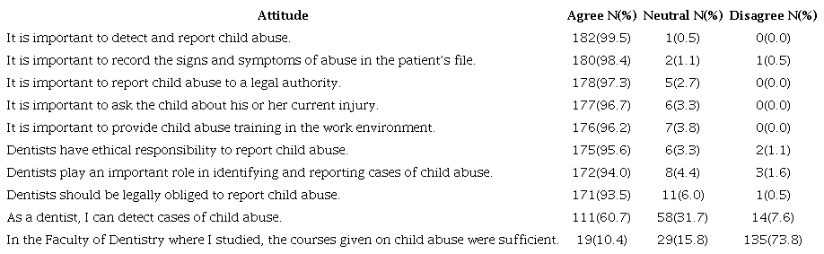 All dentists who participated in this study stated that they needed more training on child abuse. Among them, 170 participants (92.9%) emphasized the need on referral procedures to relevant authorities, 170 (92.9%) on legal aspects and 153 (83.6%) on signs and symptoms. While 121 participants (66.1%) requested verbal training, 23 (12.6%) had request for written and 38 (20.8%) for both verbal and written training.