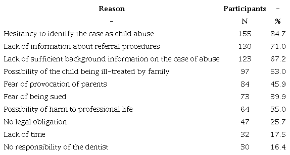 The most commonly stated reasons were hesitancy to identify the case as child abuse, lack of information about referral procedures, and lack of sufficient background information on the case of abuse. Table 6 shows the exhibition of the dentists’ attitudes about the reasons for low rate of reporting on child abuse.