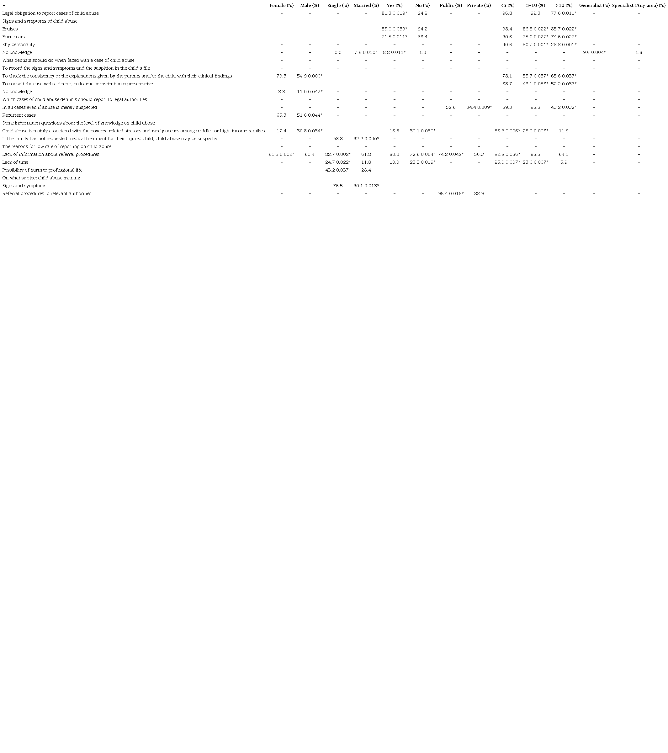 In their study, Owais et al. (10) determined a statistically significant difference between the reporting rates of dentists in private practice and those employed by a university. According to this, most dentists working in private practice selected the option of not reporting. Furthermore, Azevedo et al. (28) found that dentists working at universities were more likely to suspect child abuse. However, some studies concluded that there was no statistically significant difference between dentists’ knowledge level on child abuse and the institution they work in, their clinical experience and specialization (32) or between dentists’ suspicion of child abuse and their gender, clinical experience and specialization (11) or between dentists’ reporting of a suspected case of child abuse and their workplace, education and duration of experience in the profession (30). On the other hand, Manea et al. (12) identified the female gender as a factor affecting attitudes on child abuse. In another study, performed by Mogaddam et al. (9), it was reported that the vast majority of dentists with the profile of older in age, female and employed at a university were able to correctly identify the signs and symptoms of child abuse and to take action upon a suspicion. The majority of dentists working in a university were also found to know better the circumstances where a child abuse report must be made. This study showed that dentists who had children and long-time clinical experience did not have sufficient knowledge about the legal obligations and signs and symptoms of child abuse. As for the knowledge on what should be done and which circumstances should be reported when faced with a case of child abuse, dentists who were male and had long-time clinical experience displayed the same inadequacy. Inadequate under- graduate education on the subject and forgetting of current information with age may have caused this situation. Besides, in a study in which high school students’ perceptions of violence were evaluated, it was found that gender affected the tendency of violence and male students had more tendencies to violence. This finding was explained by the fact that, despite the importance and tolerance given to the male child in the society in question, the child experiences more violence due to the rebellious behavior during adolescence and tends to experience violence in the face of problems (33). Therefore, it should be noted that male dentists’ identification, diagnosis and reporting of cases of child abuse can be influenced by the effect of gender on tendency of cultural violence. The fact that special dentists are more knowledgeable about the signs and symptoms of child abuse as compared to general dentists is indicative of the positive effects of specialization education in a university, both in terms of learning from the institution and from colleagues and also staying up to date with information and to follow the literature. Upon a glance at the reasons of low report rates in cases of child abuse, it was understood that dentists who were female, single, childless, working in the public sector and little clinical experienced were more concerned. This may be related to the low level of awareness, experience and education of younger dentists about the subject. It is also important that physical and emotional punishment for disciplining the child in the family is considered normal and not seen as an abuse in Turkish society in which the dentists participating in this study live (24). Considering that the dentists’ perceptions of violence are influenced by cultural characteristics, changing beliefs and attitudes towards the violence through education is also important in preventing, diagnosing and reporting child abuse.