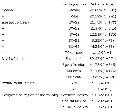 In total, 822 dentists participated in the survey (Table 1). The percentages of dentists located in Northern Mexico, Central Mexico and Southern Mexico were 25%, 55% and 20%, respectively. Most dentists-94%-indicated that they worked in private dental practices, while a few dentists-6%-indicated that they did not. Only 48% of dentists were registered as members of a dental association. Of the respondents, 53% of dentists reported private dental practice as their only job activity, while 47% of dentists had an extra job, primarily at an institution. Of the dentists working at an institution (n=388), 27% indicated working at a public health institution, 17% at a private health institution, 30% at a public university and 26% at a private university.