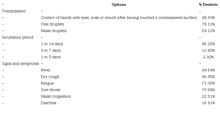 For safety, dentists need to know about COVID-19. In our study, almost all dentists identified contact of hands with eyes, nose or mouth after having touched a contaminated surface as a transmission mode. They reported less recognition of oral and nasal droplets as a transmission mode as well as signs and symptoms of COVID-19. That limited knowledge places both dentists and their patients at risk, because strategies to avoid COVID-19 require the identification of transmis- sion modes, signs and symptoms of the disease (2,3). The primary signs of COVID-19 (fever and dry cough) were identified by almost all dentists, but the minor signs were identified less often. Hence our respondents might be unprepared for the efficient screening of patients for signs and symptoms of COVID-19 before the visit to the dental office. Our finding agreed with the results of other studies that have reported also that dentists have identified the primary signs of the COVID-19 but they have identified poorly the secondary signs (12,14,16,17).