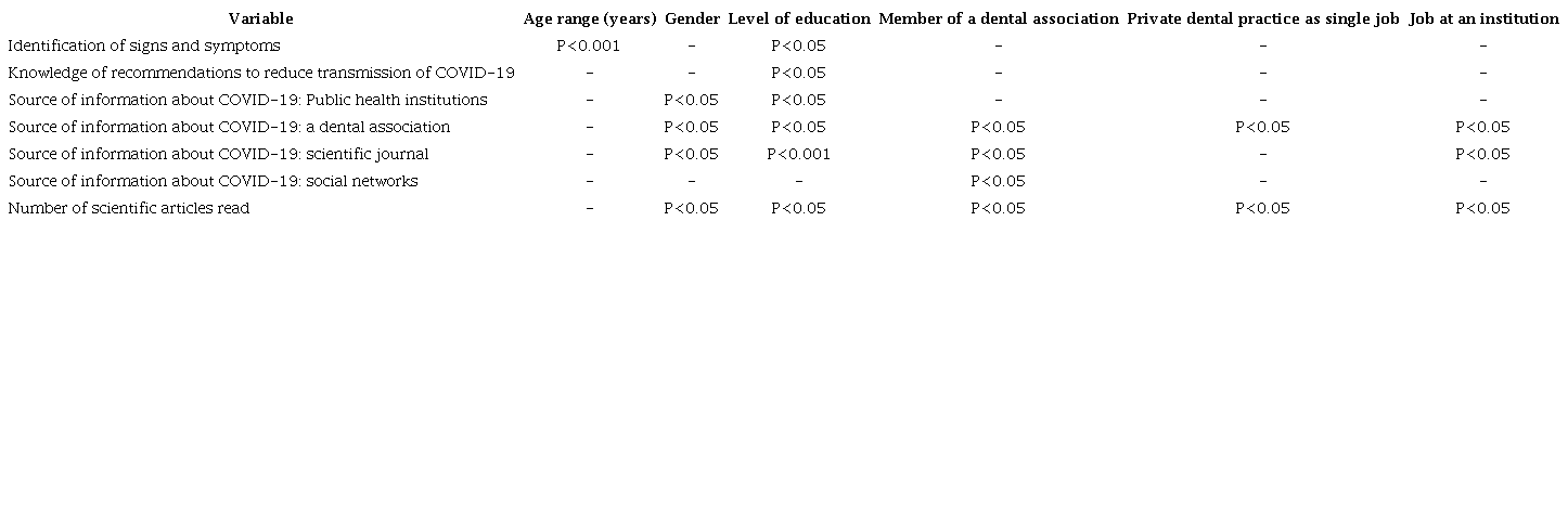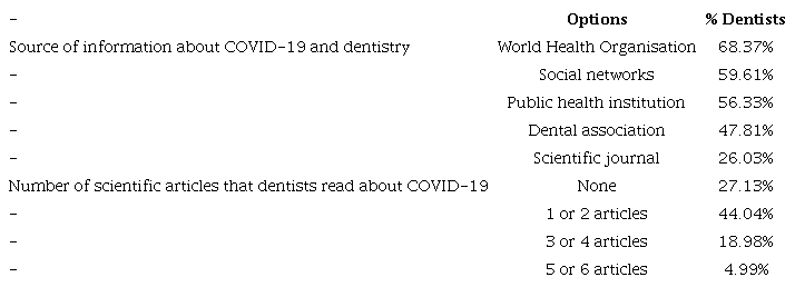 We investigated the choice of sources from which dentists sought information about dentistry and COVID-19. More dentists (68.37%) indicated the WHO as a source of information, although, to our knowledge, the WHO has provided general information for health workers but not specifica- lly for dentists. Almost 60% of dentists indicated social networks as a source of information. Social networks are efficient tools for sharing scienti- fic information, and health authorities and dental associations should take advantage of them and share information for dentists during the virus outbreak. At the same time, dentists should be wise in selecting information from social networks, because misinformation and conspiracy theories about COVID-19 abound (27,28). Of the survey respondents, 56.33% of dentists indicated that they receive their information from public health institutions. In Mexico, the Ministry of Health controls those institutions; thus, its poor and delayed actions to inform and protect dentists from COVID-19 might be the reason that dentists had low interest in them as a source of informa- tion. Regarding a dental association as a source of information, the percentage of dentists citing that source (47.81%) was very similar to the percentage who belonged to a dental association (48.05%). Thus, the information on dentistry and COVID-19 given by a dental association reached its members exclusively. Indeed, belonging to a dental association was a variable associated with getting information from a dental association (Table 5) and represented an advantage for gaining knowledge about dentistry and COVID-19.
