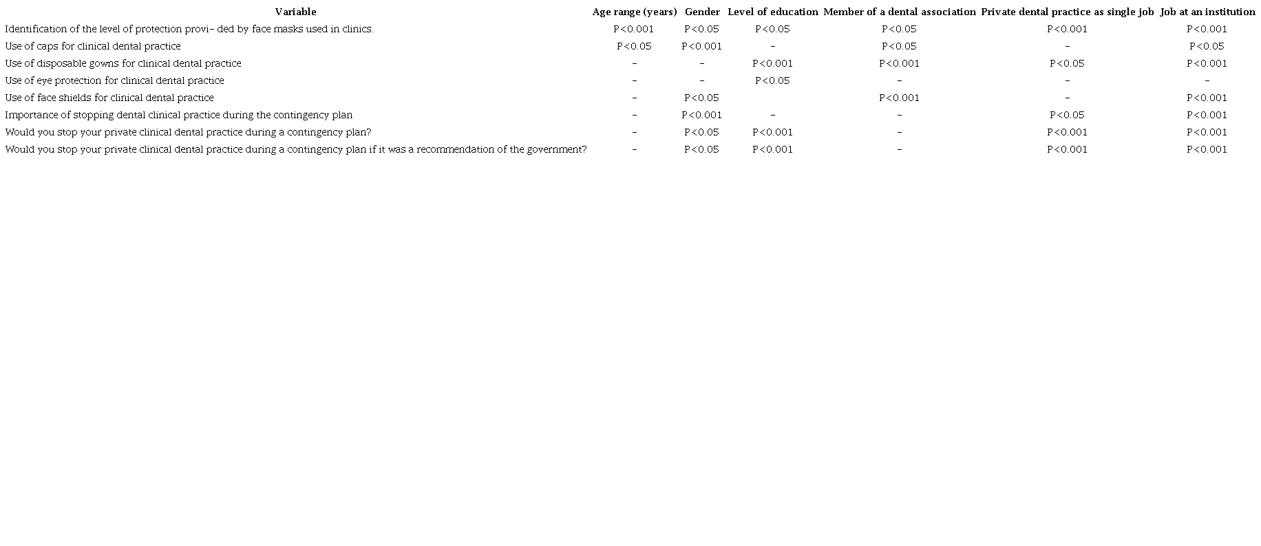 To identify possible statistically significant differences among variables, we applied a Chi-square test for variables of demographics and variables of knowledge on COVID-19, attitudes toward using PPE and attitudes toward stopping dental clinical practice. Tables 5 and 6 show the crossing of variables that showed statistically significant differences (P<0.05).