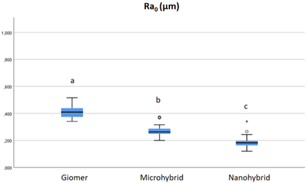 When the data obtained from the comparison of giomer, microhybrid and nanohybrid composite main groups were evaluated; it was observed that the group with the lowest initial surface rough-ness was the nanohybrid composite group, while the group with the highest value was the giomer group. A significant difference was found between the main groups in the pairwise comparison of the restorative materials (p<0.05).