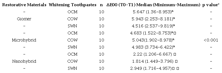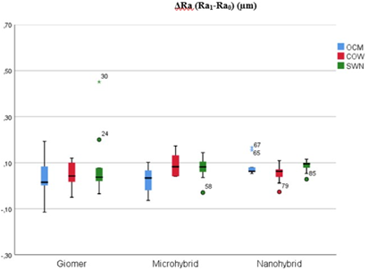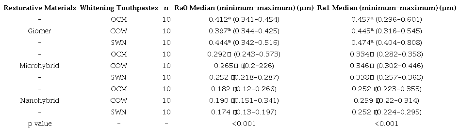 The first surface roughness values (Ra0) of the subgroups of the restorative materials and the end surface roughness values (Ra1) after brushing with OCM, COW and SWN are shown in Table 3, and the median ΔRa (Ra0-Ra1) values of the subgroups are shown in Figure 2.