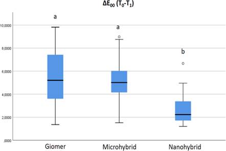 In the same main group, the subgroups that provided the most colour change were the COW subgroup of the giomer and microhybrid composite main groups, and the SWN subgroup of the nanohybrid composite main group. Both toothpastes contain hydrated silica as an abrasive leads to the thought that hydrated silica may be more effective than the silica contained in OCM on colour change.