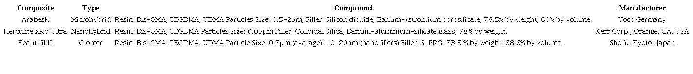 In the current in-vitro study, A2 colour, giomer (Beautifil II, Shofu, Japan), microhybrid composite (Arabesk, Voco, Germany) and nanohy- brid composite (Herculite, Kerr, USA) restorative materials were used. The contents of the materials are shown in Table 1. In order to compare before-after measurements with 95% confidence level (α= 0.05) and 80% power (β: 0.20), the minimum number of samples to be taken per group was calculated as 10 when the effect size was predicted as 1.04. The materials were placed in a specially prepared 2mm thick and 10mm wide polyethylene Teflon mould and lightly pressed with a glass plate to remove excess. The polymerization was carried out with a II. generation LED light device (Guilin Woodpecker Medical Instrument Co., Guilin, China) which produces light intensity with of 800 mW/cm² and a wavelength of 460-480nm. Each sample was cured for 20 seconds (8 J/cm²) in accordance with the manufacturer's recommendations. Thirty disc-shaped samples obtained from each material were polished with the help of coarse, medium and fine polishing discs (OptiDisc, Kerr, USA) in accordance with the manufacturer's instructions. Subsequently, all samples were kept for 24 hours in distilled water at 37°C. After those 24 hours, each material was divided into three subgroups (n=10) and the basic colour values (T0) of each sample in the group were measured and recorded using a spectrophotometer (VITA Easyshade V, VITA Zahnfabrik). Initial surface roughness values (Ra0) were determined and recorded using a mechanical profilometer (Mitutoyo SJ-210, Japan).