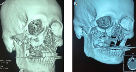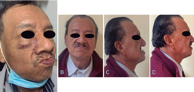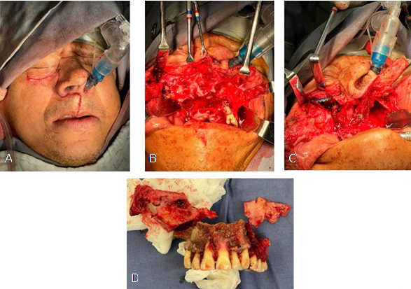 The patient was diagnosed with pneumonia due severe COVID-19, with the next symptoms: dyspnea, fever, body pain, anosmia, dysgeusia; was hospitalized during thirty days, admitted at the hospital with 70% oxygen saturation, requiring supplemental oxygen; later, was admitted at Intensive Care Unit (ICU) for assisted mechanical ventilation (AMV) for eleven days, receiving ascorbic acid (1 g), oseltamivir (75 mg), azithromycin (500 mg) and intravenous prednisolone and/or dexamethasone (6-12 mg). It is important to highlight that at the beginning of the COVID-19 pandemic there were still no vaccines available; in addition, the patient required oxygen for thirty days. So, upon discharge from the hospital, without covid, the patient went to the maxillofacial surgeon; clinical history and informed consent was signed, sinusitis diagnosis was discarded, with four months since the evolution disease, at extra oral evaluation, the patient show pain at palpation in maxillary region, local lymphadenopathy, and limited mouth opening. In the intraoral evaluation was observed an increase of volume in vestibular region, absence of several dental organs; this area was sensitive to palpation with strong pain. The patient was submitted at axial computerized tomography (ACT) of massive facial, skull, orbital and para nasal sinus, axial simple and coronal, and panoramic X-ray, where were evidenced radiolucent zone in the right and left maxillary, malar both, and orbital floor. ACT show evidence of diminished bone density at maxillary level, osteolytic changes in maxillary bone in middle line, anterior wall and lateral of maxillary sinus and orbit floor, osteolytic changes at level of ethmoid sinuses in wall of right maxillary sinus, without data of neoplastic infiltra- tion (Figure 1). An incisional biopsy of nasal bone by endoscopy was performed for pathologic study and cellular culture. Final diagnosis was chronic bi-maxillary osteomyelitis with colony microbiological compatible by Actinomyces spp. The patient was hospitalized by 5 days, Infectiology Service solicited antibiogram assay, the patient was treated with intravenous ceftriaxone (2 g) and moxifloxacin (400 mg) during fifty days. At two days of hospitalized, the patient was submitted to surgical intervention, where maxillofacial surgeons performed extensive sequestrectomy, type II maxillectomy in left maxillary and type III maxillectomy in right maxillary without exanteration, dehybridization and decortication of right and left maxillary, malar bone both, nose bone and right orbit floor, where was collocated at surgical time a nickel-titanium plate; the surgery consisted in amplified total bilateral maxillectomy, through the surgical technique Weber-Fergusson (Figure 2), which the paralateralonasal incision descends from the superior- internal angle of the orbit medially with respect to the internal canthus of the eye, runs though the nasolabial fold, surrounding the wing of the nose, cross the base of the columella and the incision descends along the midline of the upper line for resections of the palate-dental plane. To avoid scar retractions in lip, a “Z” incision was made (zetoplasty). The time of operating room was 6 hours approximately, balanced general anesthesia was administered, supplied by intravenous via several opioids (fentanyl), hypnotic drugs (propofol), neuromuscular blocker (rocuronium), for posterior nasotracheal intubation by video- laryngoscopy. External non-absorbable monofilament suture nylon 5-0 with sub-dermic points was performed, absorbable suture monofilament vicryl 4-0, was employed inside mouth with simple points and horizontal matress. In post- operative were administered routine analgesic (ketorolac 60 mg, 1 gram of paracetamol, intravenous via both), at patient was collocated a subclavian catheter, later in home intravenous via through the catheter was administered by nursery, ceftriaxone (1 g), moxifloxacin (400 mg) via oral during one-month, sublingual ketorolac (30 mg) during three days and oral rinses with 0.12% chlorhexidine for ten days. Three months later of the surgical procedure, the patient shows pain absence, increased mouth opening, at six months later, the patient remitted improvement, good prognosis and was referred with maxillofa- cial prosthetist, which collocated maxillary total prosthesis (maxillary obturator) that separates nasal cavity of oral cavity, showing the patient difficulties for emitting your voice and to eat at first. One year after surgery, the patient was evalua- ted again, showing success in treatment, without osteomyelitis evidence, at two years follow-up the patient was discharged, without pain or pathological signs or symptoms (Figure 3) and pending facial reconstruction.