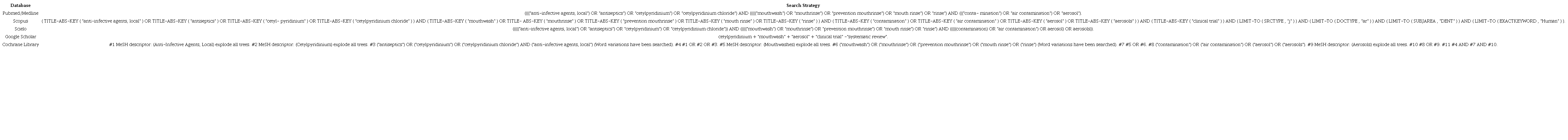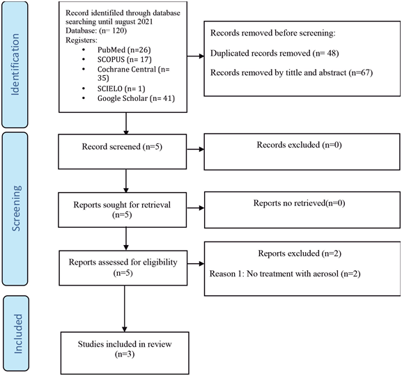 A bibliographic search was carried out in 5 electronic databases: Pubme/Medline, Cochrane library, Scopus, Scielo and Google Scholar until August 2021; combining the keywords and titles according to the thesaurus of each database: "anti-infective agents, local", "antiseptics", "cetylpyridinium", "cetylpyridinium chloride", "mouthwash", "mouthrinse", "prevention mouthrinse", "mouth rinse", "rinse", "contamination", "air contamination", "aerosol". The literature search strategy is available in Supplemental material (Table 1).