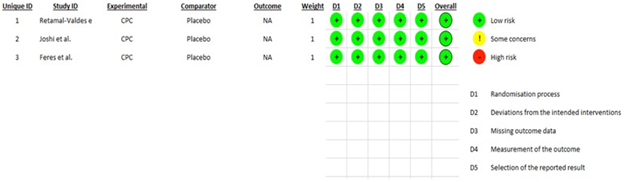 The data search was carried out following the Cochrane Library guidelines, managing to identify the type of risk in the studies. The RoB 2.0 was used to determine the risk of bias in randomized clinical trials (Figure 2). Clinical trials were assessed across five domains, then classified as: low, some concern, or high risk of bias. Included studies were independently assessed by two calibrated authors (JPAT and AILF) using RoB 2.0. Ultimately, all disagreements were resolved by discussion with a third reviewer (HIAV).