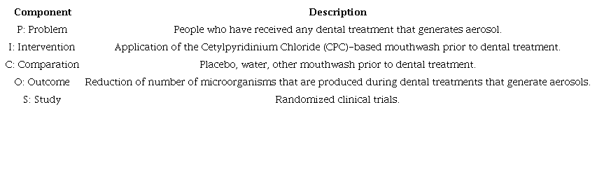 To prepare and structure this review, the question was formulated using the PICO format (population, intervention, comparison and results) as detailed below: a) population: patients who have received any dental treatment that generates aerosol. b) intervention: application of CPC mouthwash prior to the dental treatment. c) comparison: placebo, water, other mouthwashes or no mouthwash before dental treatment. d) results: reduction of microorganisms that are produced during dental treatments that generate aerosols.