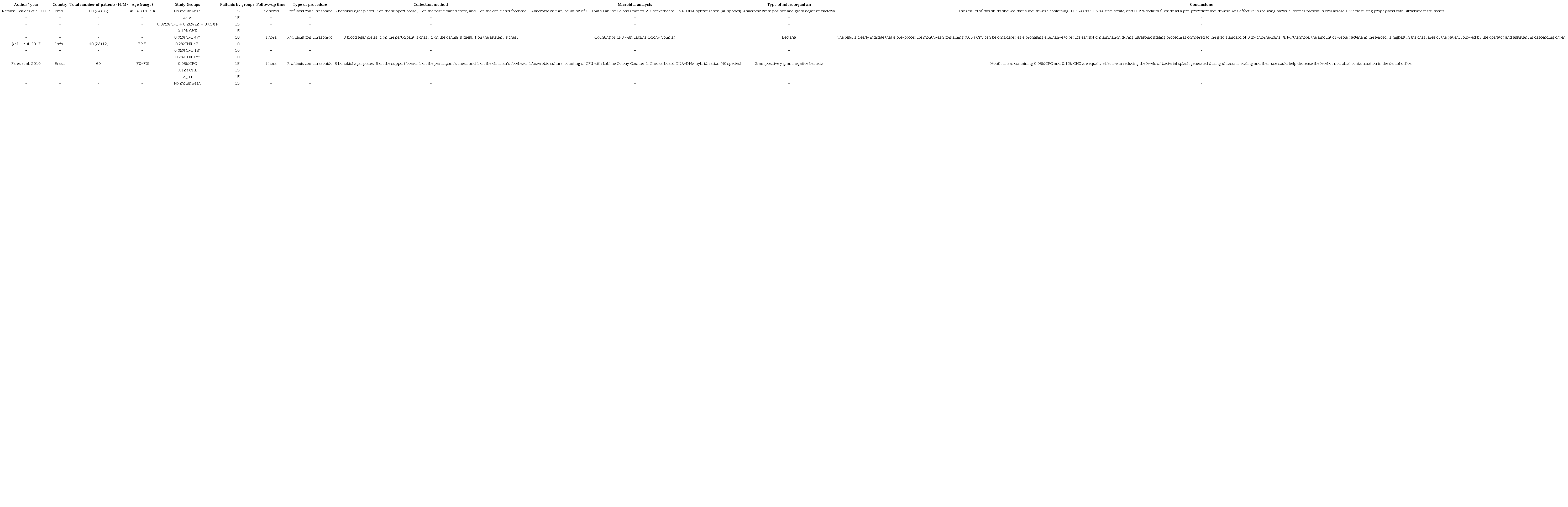 In all the articles, the experimental group was the use of CPC (in different concentrations and/or with other components) and the control group was chlorhexidine, water and the non-use of mouthwash prior to spray treatment. Follow- up time ranged from 1 to 72 hours. All articles described ultrasound prophylaxis as an aerosol- generating procedure and the microorganisms found were gram-positive and negative bacteria. All studies concluded that the use of CPC is effective in reducing bacteria during the ultrasound prophylaxis procedure; however, one of the studies mentions that CPC is better than CHX and other mentions that both are equally effective (Table 3).