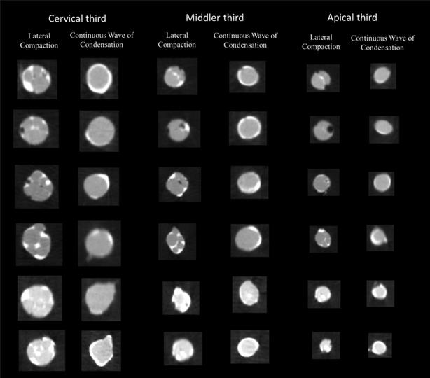 The aim of this study was to compare the percentage of filling and voids in mesial canals of mandibular molars filled by a continuous wave of condensation system or lateral compaction, using micro-CT analysis with the resolution of 9μm. The null hypothesis was that there would be no significant difference in the percentage of voids and filling using continuous wave of condensation system or lateral compaction.