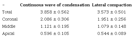 The apical third is considered critical for endodontic treatment success (28) and control of re-infection (29). Our results showed that the root canals obturated with the Termo Pack II System obtained a lower percentage of voids in the apical region, than the root canals obturated by the lateral compaction technique. These results corroborated previous results that compared the quality of filling in the apical regions in mesial roots of mandibular molars, prepared up to the ProTaper Next X4 instrument, and obturated by continuous wave of condensation or lateral compaction (13).