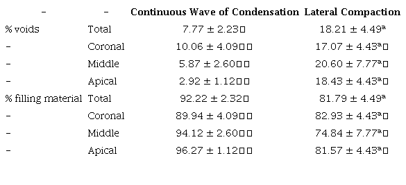 In conclusion, none of the techniques used was able of completely filling the root canals. The continuous wave of condensation Termo Pack II System produced a higher percentage of filling material and lower incidence of voids when compared with the lateral compaction technique.