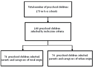 The study population consisted of preschool children aged 3 to 5 years enrolled in two public early childhood education institutions (ECEI) and their respective parents or caregivers, belonging to a rural and urban area in the Cusco region of Peru. For the rural area, ECEI Nº469 in the Ccorao community, located in the San Sebastián District, and for the urban area, ECEI Niño Jesús, located in the Cusco District, were selected. The sampling frame was the register of students enrolled in the ECEIs in 2019, established in the Ministry of Education’s database. The two public kindergartens had a total of 179 preschoolers, 148 children were chosen: 74 from the rural area and 74 from the urban area. Due to the small size of the population, it was decided to work with all of the preschoolers who met the inclusion and exclusion criteria, therefore, there was no need to perform a sample calculation; it was decided to have the same sample size for each group based on the smallest group (Figure 1). Children whose parents signed the informed consent for their participation in the study were included, and those with systemic and neurological diseases were excluded.