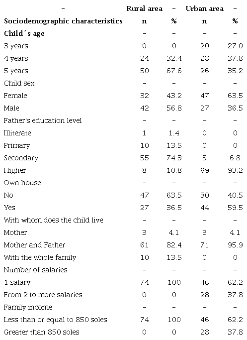 Regarding the sociodemographic characteristics of the children evaluated, in the rural area, the most frequent age group was: 5 years old (n=50,67.6%), male sex (n=42,56.8%), father’s secondary schooling (n=55,74.3%), not owning their home (n=47,63.5%), nuclear family type: the child lived with both parents (n=61,82.4%), and the family had only one salary and an income of 850 soles or less (n=74,100%). In the urban area children aged 4 years (n=28,37.8%), female sex (n=47,63.5%), higher education level of the father (n=69,93.2%), own home (n=44,59.5%), child living with both parents (n=71,95.9%), family income depended on a single salary (n=46,62.2%) and with an income less than or equal to 850 soles (n=46,62.2%) were more frequent (Table 1).