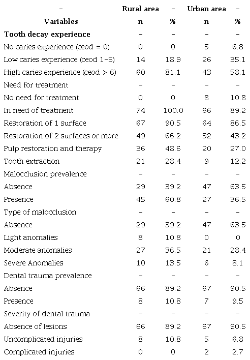 In children from the urban area there was a high caries experience (n=43,58.1%) and the need for restoration of at least one surface treatment (n=64,86.5%). Most of them did not present malocclusion, however, among those who did, moderate anomalies were more frequent (n=21,28.4%) and seven children presented dentoalveolar trauma, with uncomplicated lesions being the most frequent (n=5,6.8%) (Table 2).