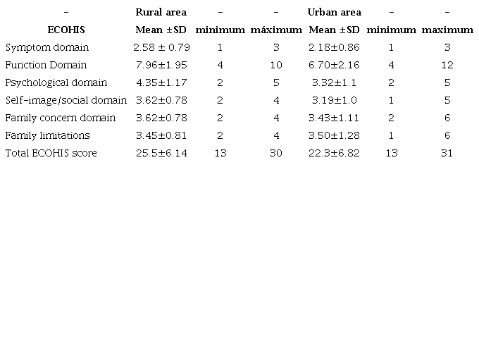 For the urban area, the maximum total score of the ECOHIS was 31 and the minimum was 13, the average being 22.3±6.82. In the Function Domain, the highest average was 6.70 for the questions about the impact on the child for: difficulties in drinking hot or cold drinks, difficulties in eating some foods, difficulties in pronouncing some words, and loss of days of attendance to their preschool activities. In second place was the Family Domain with 3.50, in the questions referring to taking time from work and affecting the economy in their family because of dental problems or dental treatments (Table 3).