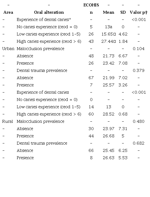 When the OHRQOL (ECOHIS questionnaire) was related to oral conditions (dental caries, malocclusion, and dental trauma) a statistically significant relationship was found only with dental caries (p<0.001) in both urban and rural areas, showing a greater negative impact on OHRQOL in children with high experience of dental caries (Table 4).