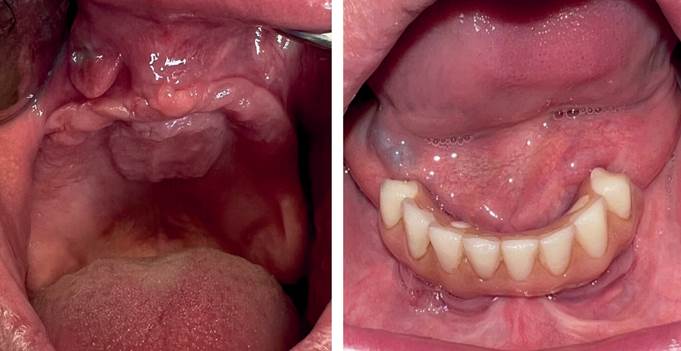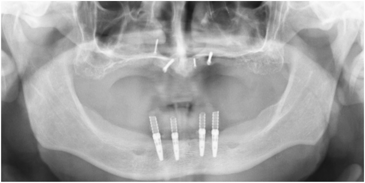 Data collection, including medical history, radiographs, clinical examination, videographic and photographic examinations, was carried out. Preoperative orthopantomography revealed an extreme maxillary atrophy, with little remnant bone (Figure 2).