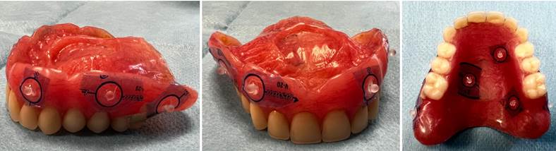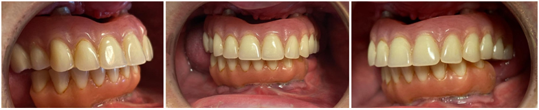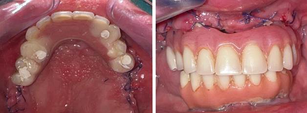 The necessary postoperative instructions were discussed. Augmentin (1000mg every 8 hours) was prescribed for 6 days. The patient was informed to follow a cold semi-liquid diet for the first 10 days, and a soft diet for the following 6 months. He was given instructions regarding oral hygiene measures and was followed up at regular intervals of 2, 7, 14, 30, and 60 days. After 48h, implants were loaded, using the previous denture, properly relined onto temporary abutments with the removal of the palatal vault (Figure 8, Figure 9).