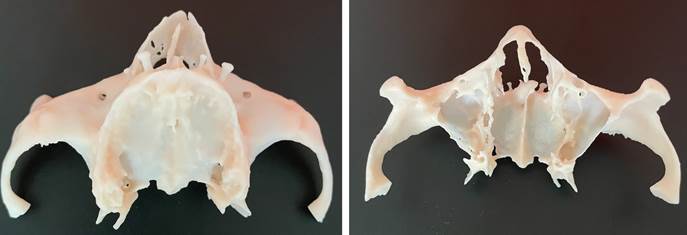 A stereolithographic model was three-dimensionally (3D) printed from the CBCT DICOM file to have better insight into the patient anatomy (Figure 6). Possible difficulties regarding treatment sequence and surgical limitations were discussed with the patient, who finally accepted the treatment plan.