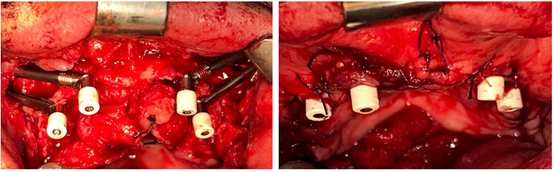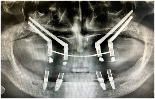 Chlorhexidine rinse and antibiotic prophylaxis with amoxicillin and acid clavulanic 2g (Augmentin, glaxosmithklein, Brentford, UK) by injection were followed before the intervention. The procedure has involved the insertion of 4 zygomatic implants (left and right canine regions, and left and right second premolar regions). Surgery was performed with an open flap: a supracrestal incision was made from one tuberosity to another, from 18 to 28. The 4 residual screws for osteosynthesis, placed in the previous implant-prosthetic rehabilitation, were removed. The positioning and fixation of the surgical template pin was achieved on the right side. Then osteotomy was performed for the implant placement. The pin and the surgical template were removed to allow the site preparation for the insertion of the first 2 implants. The first Zygomatic implant (Straumann, Basel, Switzerland) measuring 55mm of length 4.4mm of diameter was positioned in position 1.3. The second Zygomatic implant (Straumann) measuring 40mm of length 4.4mm of diameter was positioned in position 1.5. The same procedure was performed on the left side, so the positioning and fixation of the surgical template pin was achieved on the left side. Then osteotomy was performed for the implant placement. The pin and the surgical template were removed to allow the site preparation for the insertion of the first 2 implants. The first Zygomatic implant (Straumann) measuring 55mm of length 4.4mm of diameter was positioned in position 2.3. The second Zygomatic implant (Straumann) measuring 52.5mm of length 4.4mm of diameter was positioned in position 2.5. Four healing screws measuring 3.5mm of length were placed.