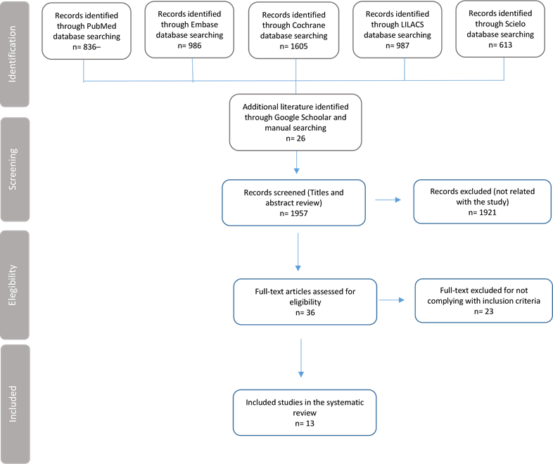 The electronic search strategy identified 1957 articles. After analyzing the titles and abstracts, 1932 studies were excluded, the remaining 25 were subject of a full text exhaustive evaluation, from which 12 were excluded. As a result, 13 papers were included in this SR (Figure 1).