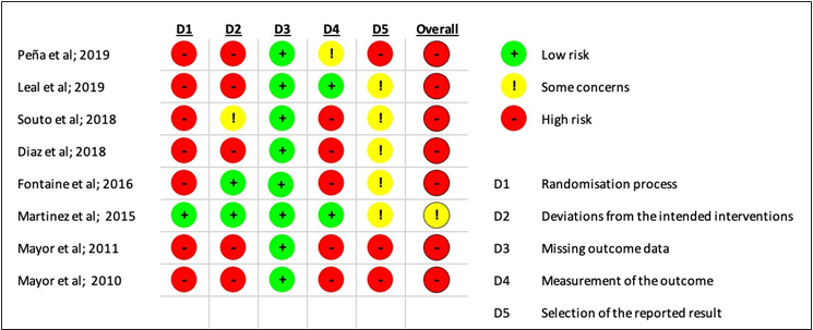 In RCT studies, inadequate methods of generating sequences and assigning participants were found in all of the publications (90%) included and only one study showed a correct assignment process between groups (Figure 2). Among the deviations from the planned interventions, 60% of the studies were classified as "high" due to problems with the masking process (Figure 3). However, it was not possible to mask the entire staff due to the experimental context. Finally, all studies reported results without a pre-specified plan. In general, it was considered that only one study had a clear risk of bias. Figures 2 and 3 show a summary of the results.