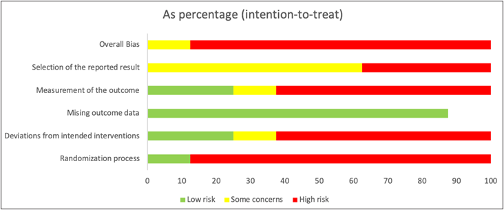 The authors of this SR decided to evaluate the result related to "assignment to the intervention (the effect for the purpose of treating)" and five domains were examined: randomization bias and treatments concealment, bias due to deviations from the planned interventions that affected the involvement of the participants and a team of researchers, although there were missing result data, the result measurement and the result selection were selected. Based on the responses to the questions and the algorithms of the tool, it was considered that each domain had “low risk of bias”, "some concerns related to risk of bias" or "high risk of bias". The studies were categorized as low risk of bias (all domains had low risk of bias), high risk of bias (one or more domains had high risk of bias) and concerning (when one or more domains had some concerns) (26). The decisions were resolved by means of discussion, consulting a third advisor (G.M).