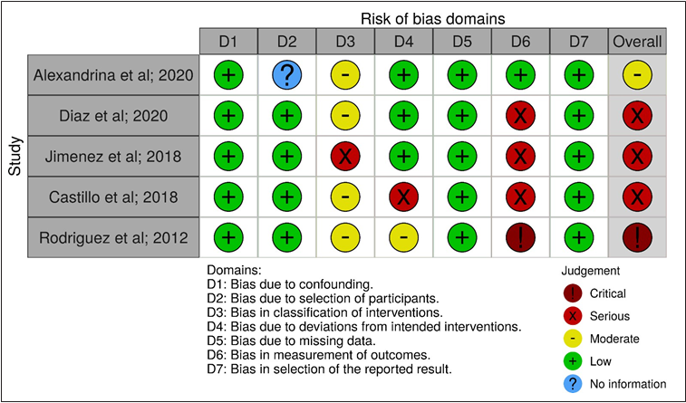 To demonstrate the general risk of bias, each study included was classified as low, moderate, severe and critical risk of bias or the absence of information according to the following criteria: