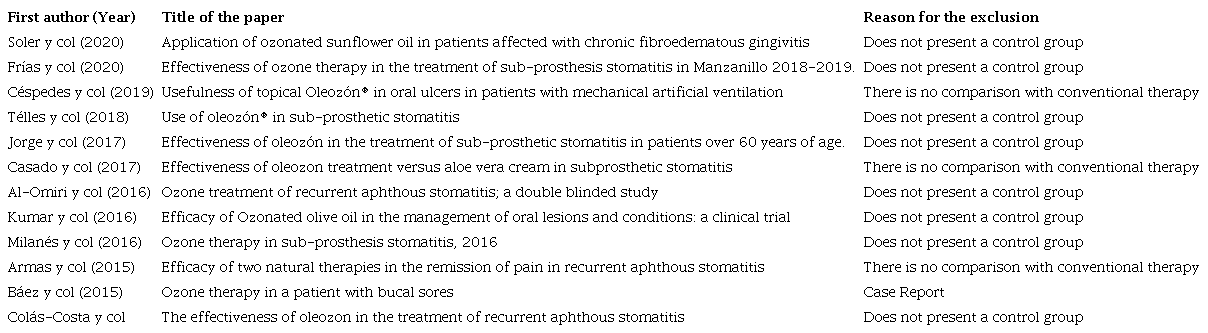 The inclusion criteria for this SR were the following: Clinical studies that used ozonated oil as a treatment for different oral lesions (subprosthetic stomatitis, recurrent aphthous stomatitis, herpetic gingivoestomatitis, pericoronaritis, alveolitis and fibroedematous gingivitis). Literature reviews, letters to the editor, short communications, case reports, pilot studies and trials that analyze other applications of ozonated acceptance not related to oral injuries were excluded.