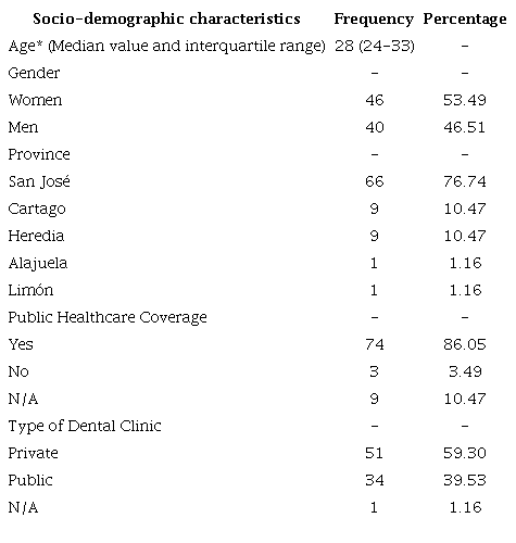 Table 1 shows the descriptive statistics. Women comprised 53.49% of PROIN students, with an average age of 28.97 (±6,57). Most students reside in the Greater Metropolitan Area; 76.74% live in San José. Regarding canton, San José Central and Desamparados prevail. On the other hand, 86.05% confirmed having public healthcare coverage and 56.76% of those confirmed visiting private dental practices (Table 1).