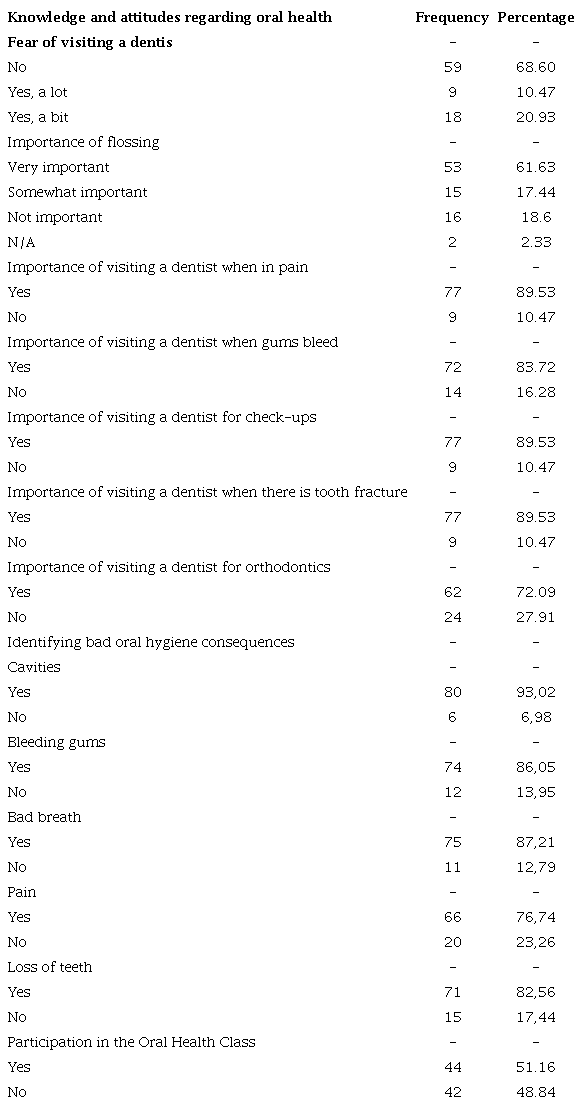 Most students were not afraid of visiting the dentist (n=59, 68.60%), while 91.86% stated that the treatment received was good or very good. However, during the qualitative approach, some said they feared the visit at some point, fear which they eventually overcame, as the following student states: