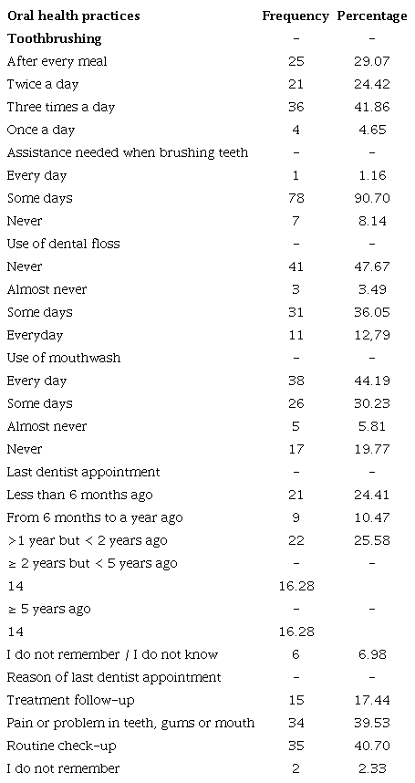 The variables considered socio-demographic characteristics, age, gender (woman/men), province (San José/Alajuela/Cartago/Heredia/Guanacaste/ Puntarenas/Limón), canton, public healthcare coverage (Yes/No) and type of dental clinic (public/ private). Knowledge and attitudes included fear of visiting a dentist (No/Yes, a lot/Yes, a bit), importance of floosing (Very important/Somewhat important/Not important), importance of visiting a dentist when in pain (Yes/No), importance of visiting a dentist when gums bleed (Yes/No), importance of visiting a dentist for check-ups (Yes/No), importance of visiting a dentist when there is tooth fracture (Yes/No), importance of visiting a dentist for orthodontics (Yes/No), bad oral hygiene consequences (Cavities (Yes/No), bleeding gums (Yes/No), Bad breath (Yes/No), pain, loss of teeth (Yes/No), importance of teeth and participation of oral health class (Yes/No). Practices included toothbrushing (After every meal/Twice a day/Three times a day/Once a day), assistance needed when brushing teeth (Every day/Someday/Never), use of dental floss (Never/Almosts never/Some days/Everyday), use of mouthwash (Never/Almosts never/Some days/ Everyday), last dentist appointment (Less than 6 months ago/From 6 months to a year ago/>1 year but < 2 years ago/≥ 2 years but < 5 years ago/≥ 5 years ago/I do not remember or I do not know) and reason of last dentist appointment (Treatment follow-up/Pain or problem in teeth, gums or mouth/ Routine check-up/I do not remember).