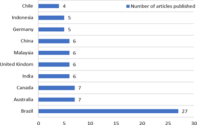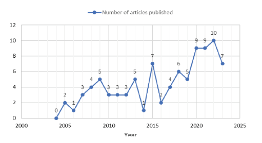 To identify translation and cultural adaptation studies of measurement instruments related to the field of dentistry, both in Peru and world- wide, we used the following search equation in Scopus: (TITLE-ABS-KEY (“translation" OR "transla- ting" OR "translated”) AND TITLE-ABS-KEY (“cultural adaptation" OR "cross-cultural adaptation”) AND KEY (“Dentistry" OR "Oral health" OR "Dental research”)). AND PUBYEAR > 2003 AND PUBYEAR < 2024 AND (LIMIT-TO (DOCTYPE, "ar”)). A total of 86 articles were identified, with 27 originating from Brazil (Figure 1). Additionally, there was an observed increase in the publication trend from 2004 to 2023, particularly notable in the last decade (Figure 2).