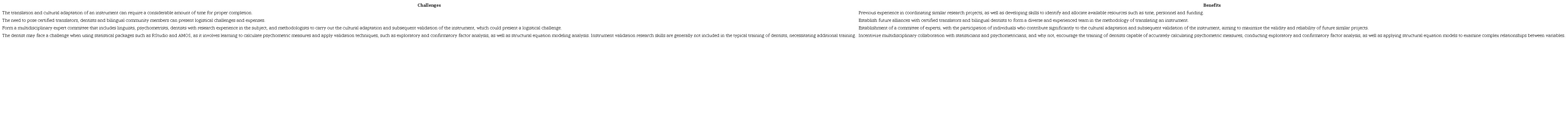 What should we do when we encounter a measurement instrument that is correctly validated and useful in Dentistry, but was developed in a country with a culture and language different from Peru? This situation poses a significant challenge for researchers, since translation and cultural adaptation can be complex and require careful consideration" researchers, as translation and cultural adaptation can be complex and require careful consideration (1). In some cases, the apparent solution of creating a new instrument can result in an indiscriminate development of instruments, which negatively affects the efficiency and optimization of resources, as well as the comparability of results, maintenance of metric characteristics and the synthesis of evidence (1,2,3,4). This problem raises fundamental questions that require discussion within the dental community. Therefore, the purpose of this letter to the editor is to identify the challenges and benefits associated with conducting studies on translation and cultural adaptation of measurement instruments in this field.