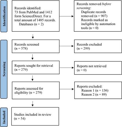 The search returned 1485 articles for inclusion in this review. After the process of selection, deduplication, and a manual review of each of the retrieved articles, a total of 54 review articles were used for this paper (Figure 1). The genera of Gram-negative anaerobic bacteria (GNB) whose OMVs have been studied in these articles correspond to Porphyromonas spp., Bacteroides spp., Aggregatibacter spp., Treponema spp., Fusobacterium spp., Tannerella spp., and Prevotella spp., in decreasing order of literature sources. None of the articles found had information on the OMVs of any other oral anaerobic GNB (Table 1). Notably, the only case for which an anaerobic GNB OMV was the primary topic of a review was for Porphyromonas gingivalis with 4 articles out of the 54 (7,4%) used in this review. The information collected from the articles was categorized into the following topics: (1) vesiculation induction and biogenesis, (2) release, (3) content, (4) trafficking and internalization of OMVs by host cells, and (5) interaction of OMVs with host cells. The information collected is detailed below.