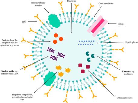 OMVs composition varies even within the same bacterial population and depends on the growth phase and environmental conditions (51, 55). However, detailed molecular analysis of OMV contents supports the idea of selective enrichment or exclusion of specific proteins, lipids and other biomolecules (47, 52, 62). Load selection mechanisms in OMVs remain incompletely understood (38, 62). A schematic representation of the content of the OMVs is presented in Figure 2.
