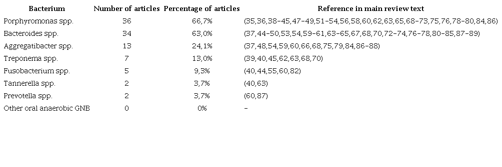 The oral environment is characterized by a highly diverse microbiota organized in biofilms whose composition varies depending on the anatomic site within the oral cavity (1). A dysbiosis, a switch from a commensal microbiota to a pathogenic community, can result from changes in the oral environment, host immune status and/or the introduction of keystone pathogens, microbes that can modify their environment and the microbiota composition (2). The transition from oral health to gingivitis and periodontal disease is triggered by a specific number of bacterial species, termed a «complex» (3). Aggregatibacter actinomyce- temcomitans, and the so-called «red complex» composed of Porphyromonas gingivalis, Tannerella forsythia and Treponema denticola are associated with periodontitis (4,5,6,7). The chronic inflammation caused by these anaerobic Gram-negative bacteria (GNB) has been associated with systemic disease.