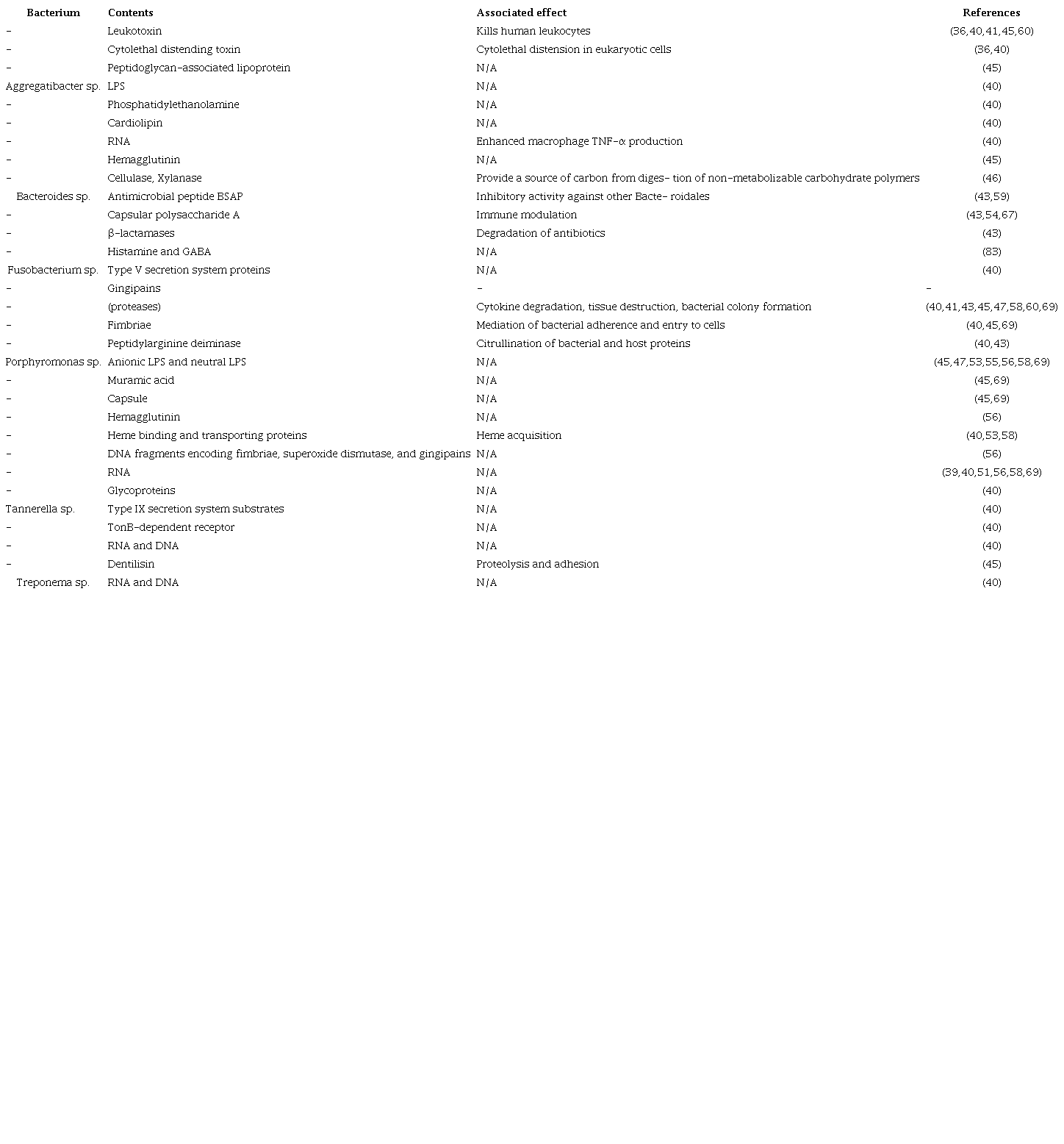 Limited information about OMVs cargo is presented in the literature that presents regulation of eukaryotic cells after OMVs content’s internalization. Besides the examples presented, and to add to the controversy about the presence of nucleic acids in OMVs, several studies presented downregulation of immune effectors after delivery of small RNAs into host cells by OMVs from A. actinomyce-temcomitans, P. gingivalis, T. denticola, and/or T. forsythia. The lack of genetic tools to inhibit vesiculation to understand OMVs implication in infections is a difficulty that should be addressed.
