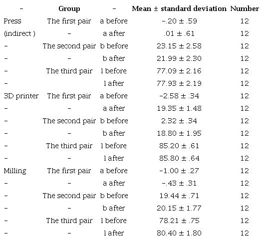 In general, the mean color changes in all three groups were obtained for a: -7.57 ± 10.34, b: -5.34 ± 8.46, and l: -1.21 ± 2.5.