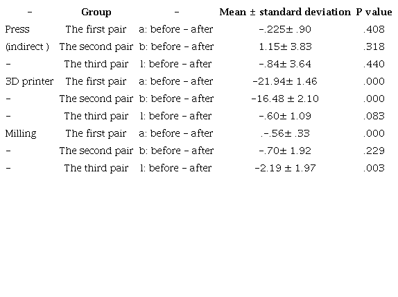 The results of Tukey's post hoc test indicated a significant relationship between the first and second pairs in the 3D printer group (P-value<0.001). Also, a significant difference was observed between the first and third pairs in the milling group. However, no significant difference was observed in the pressing group (P>0.005).