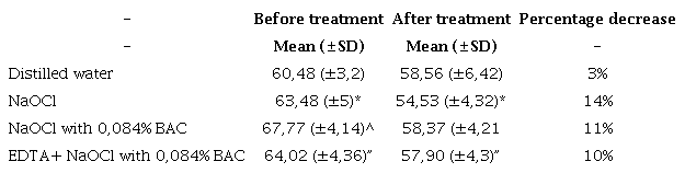 Table 1 contains the descriptive statistical results of changes in root canal dentin after treatment with the solutions. Comparison of microhardness values before and after treatment showed that treatment with NaOCl, NaOCl with 0.084% BAC, and EDTA + NaOCl with 0.084% BAC