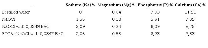 As a result of the study, NaOCl, NaOCl with BAC, and concomitant use of EDTA and NaOCl with BAC decreased the microhardness of dentin. However, there was no statistical difference between the groups. The aforementioned solutions did not cause a significant change in the mineral content of dentin.