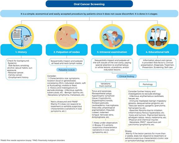 A complete and systematic clinical oral assessment is essential for detecting any lesion or variation. This assessment must be performed in the same order in each of the evaluated patients to ensure that no findings are omitted, including palpation of nodes and review of each of the structures of the oral cavity, starting with the lips (15). All observations must be properly documented in the dental record per the legal requirements of each country (16,17).