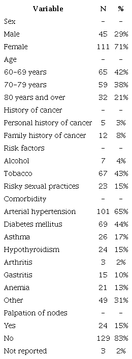 A total of 156 patients were examined. Most of the participants were female (71%), 42% of them were between 60 and 69 years of age, 43% had smoking as a risk factor, 65% had reported a history of arterial hypertension, and 44% had diabetes mellitus as comorbidities. Additionally, 15% of the participants had palpable lymph nodes (Table 1).