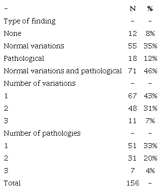 The intraoral examination findings most frequently found were both normal variations and pathology (46%): about 43% of the participants had only one variation from normal, while 33% exhibited one pathology (Table 2).